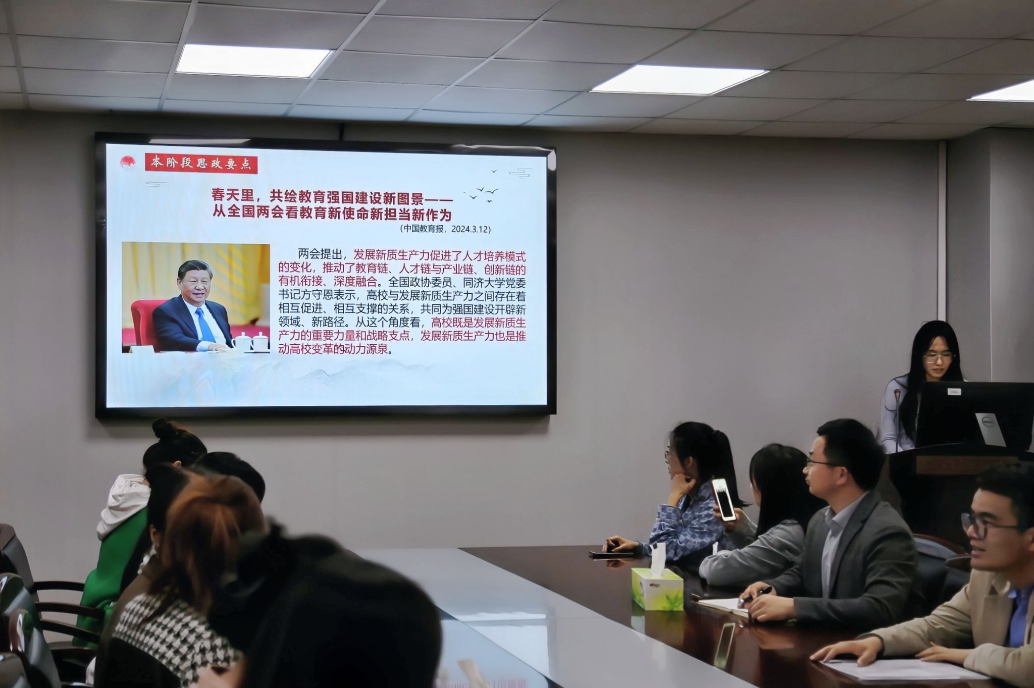 在“学习摘要”中,人文学院辅导员潘昕仪介绍了本阶段的思政要点,强调坚持把立德树人作为中心环节,把高质量发展作为各级各类教育的生命线,把思想政治工作贯穿教育教学全过程,加强全民国防教育,加大高校毕业生就业支持力度,努力开创我国高等教育事业发展新局面。同时,积极响应两会发展新质生产力的号召,让高校成为发展新质生产力的重要力量和战略支点,促进新质生产力成果的传播和应用,以推动高校变革和科研水平的提升,共绘教育强国建设新图景。