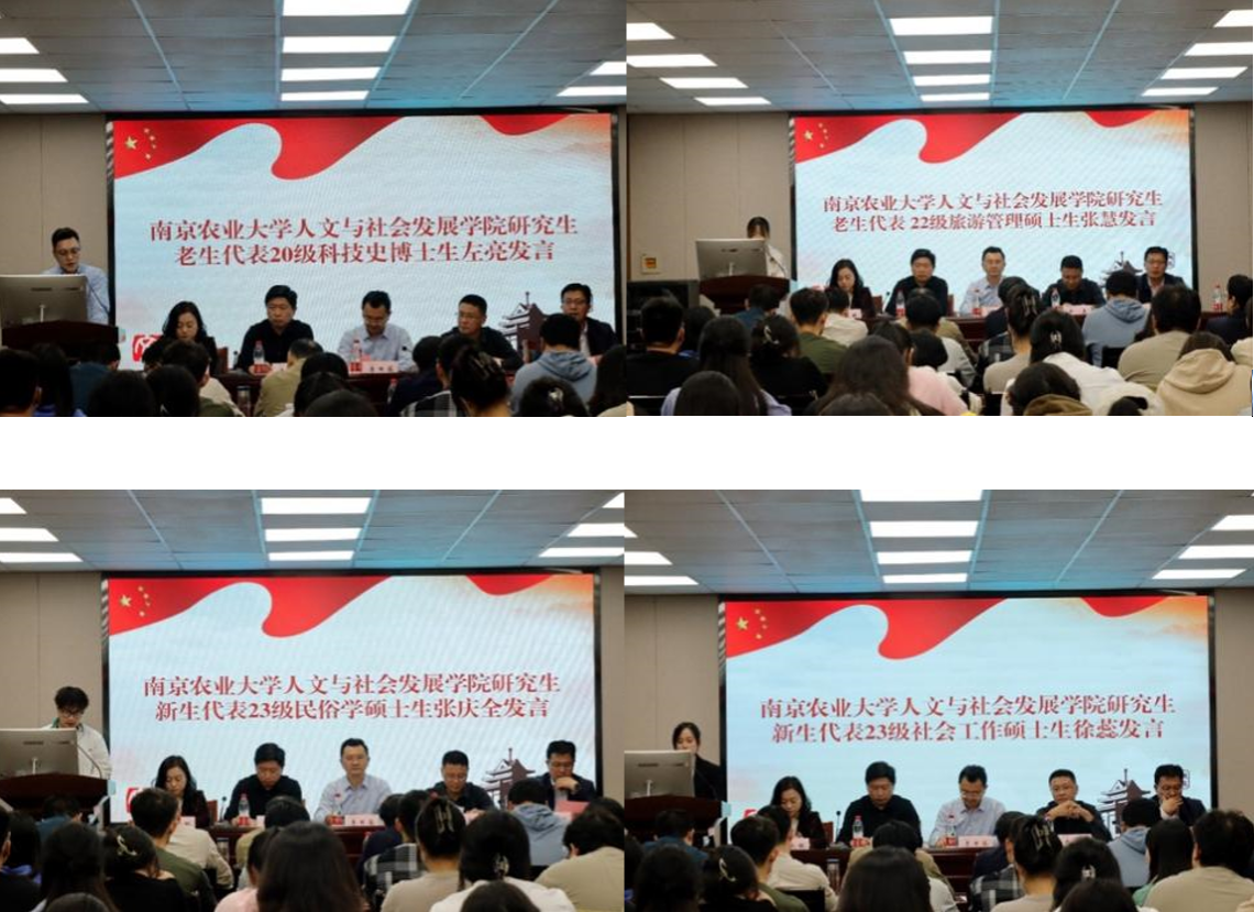 20级科技史博士生左亮、22级旅游管理张慧作为老生代表发言,23级民俗张庆全、23级社会工作徐蕊作为新生代表发言。