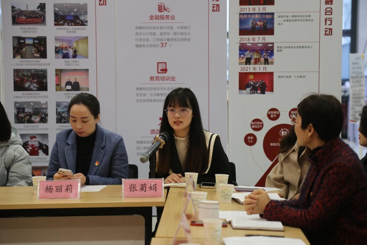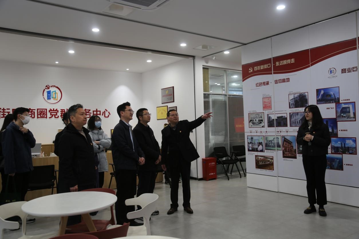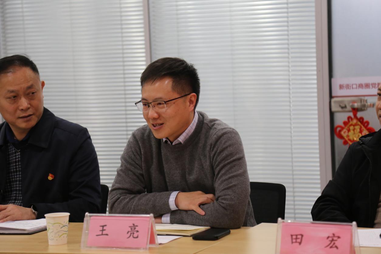 在新街口商圈党群服务中心,李日葵介绍人文学院开展“党建+”模式在引领学科交叉融合发展、凝聚师生团结奋进以及助力乡村振兴方向的目标和工作进展。戚秋生从商圈组织建设、队伍建设和联动发展三个方面,介绍了在新经济组织、新社会组织中开展“两新”党建,达到从促进企业、员工健康发展到促进商圈高质量发展的历程、工作方法和取得的成绩。与会的政企事业单位代表分别就党建工作方法、党建引领促进业务发展经验、优势互补、资源共享以及共建意愿进行了充分的交流。