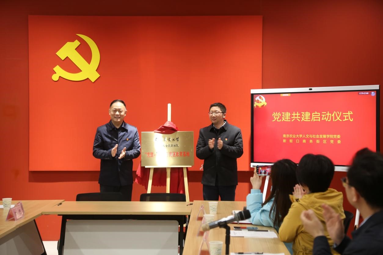 李宁松和熊富强共同为人文学院“党建+新街口商圈教育基地”揭牌。戚秋生和李日葵代表双方单位共同签署党建共建协议书。双方商定将在政治理论联学实践活动联办、推进产教融合协同创新发展、弘扬志愿精神聚力服务社会等方面加强交流互动。