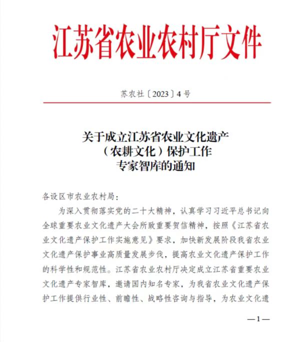 近日,江苏省农业农村厅苏农社[2023]4号文件发布了《关于成立江苏省农业文化遗产(农耕文化)保护工作专家智库的通知》,18av