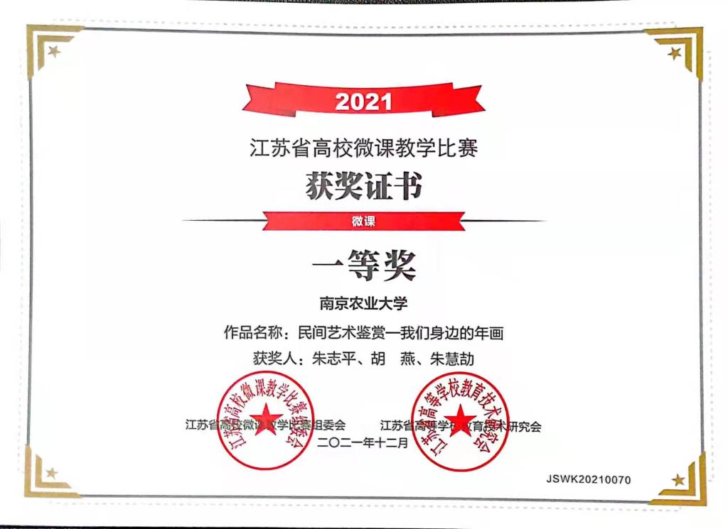 为深入贯彻落实全国教育大会精神,促进本科“双一流”建设和高职“三教”改革,推进信息技术与教育教学深度融合,全面提升高校教师专业化水平和创新能力,以赛促教,以赛促学,以赛促建, 在苏省教育厅指导下,江苏省高校微课教学比赛组委会主办,江苏省高等学校教育技术研究会承办了2021年全省高校微课教学比赛。经学校遴选,18av 朱志平、胡燕、朱慧劼三位老师提交的《民间艺术鉴赏——我们身边的年画》微课在获得18av 微课比赛一等奖的基础上,被推荐参加江苏省高校微课教学比赛,最终获得全省一等奖。(院办供稿)