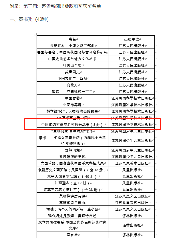 王思明教授生前担任编委会主任的“中国传统村落与乡村振兴”丛书获得江苏省新闻出版政府奖图书奖。