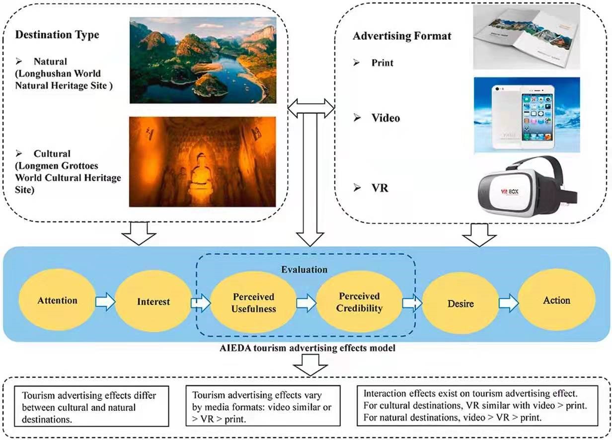 该文通过现场实验法,采用6组组间实验设计提出了一个旅游营销效果的实证模型(AIEDA)。该模型考虑到旅游产品生产与消费的同时性及不可尝试性特征,拓展了营销领域的AIDA模型,增加了新的变量Evaluation,需要对旅游营销信息进行有用性及可靠性评估。AIEDA 模型由Attention→ Interest→ Evaluation (Perceived Usefulness→ Perceived Credibility) → Desire →Action构成,论文使用结构方程模型对该模型进行了实证检验。此外,论文利用该模型,对世界文化遗产(洛阳龙门石窟)和世界自然遗产(江西龙虎山)进行了实证分析,对比了宣传册、宣传片及VR等不同媒介方式的旅游营销效果,为旅游目的地可持续发展提供了对策与建议。