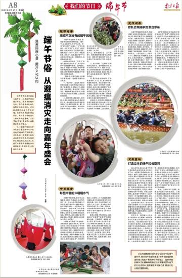 张娜老师《端午节俗:从避瘟消灾到嘉年盛会》一文被《南京日报》2020年06月25日A8版整版刊登,文章主要从以下几个部分展开:一是回顾南京独特的端午民俗系统,主要从驱邪避害、节日饮食、竞技娱乐三大类开展。基于典籍文献,文章历数了老南京的“破火眼”,挂辟邪图、菖蒲艾叶,折五毒牌等祛病防疫的端午民俗形式,食“粽”、“五毒菜”、“雄黄豆”、“吃五黄”和“吃五红”等丰富的端午饮食文化,以及龙舟竞渡等端午竞技娱乐,呈现出多彩生动的金陵端午民俗记忆。二是发展重构南京端午民俗,打造立体化的端午民俗空间。文章认为传统能在发展重构中释放出强大精神力量,指出政府在带动民众积极打造出一个多层次、立体化的端午民俗空间,诸如开展公共防疫知识普及课、再现端午龙舟竞技盛景、举办端午诗吟快闪,以端午节日为契机塑造非遗展示体验空间等。最后,文章指出南京端午民俗从避瘟消灾的民俗记忆走向端午嘉年盛会,将重新回到当下文化空间,发挥着滋养民族心灵、提升文化认同的重要作用。
