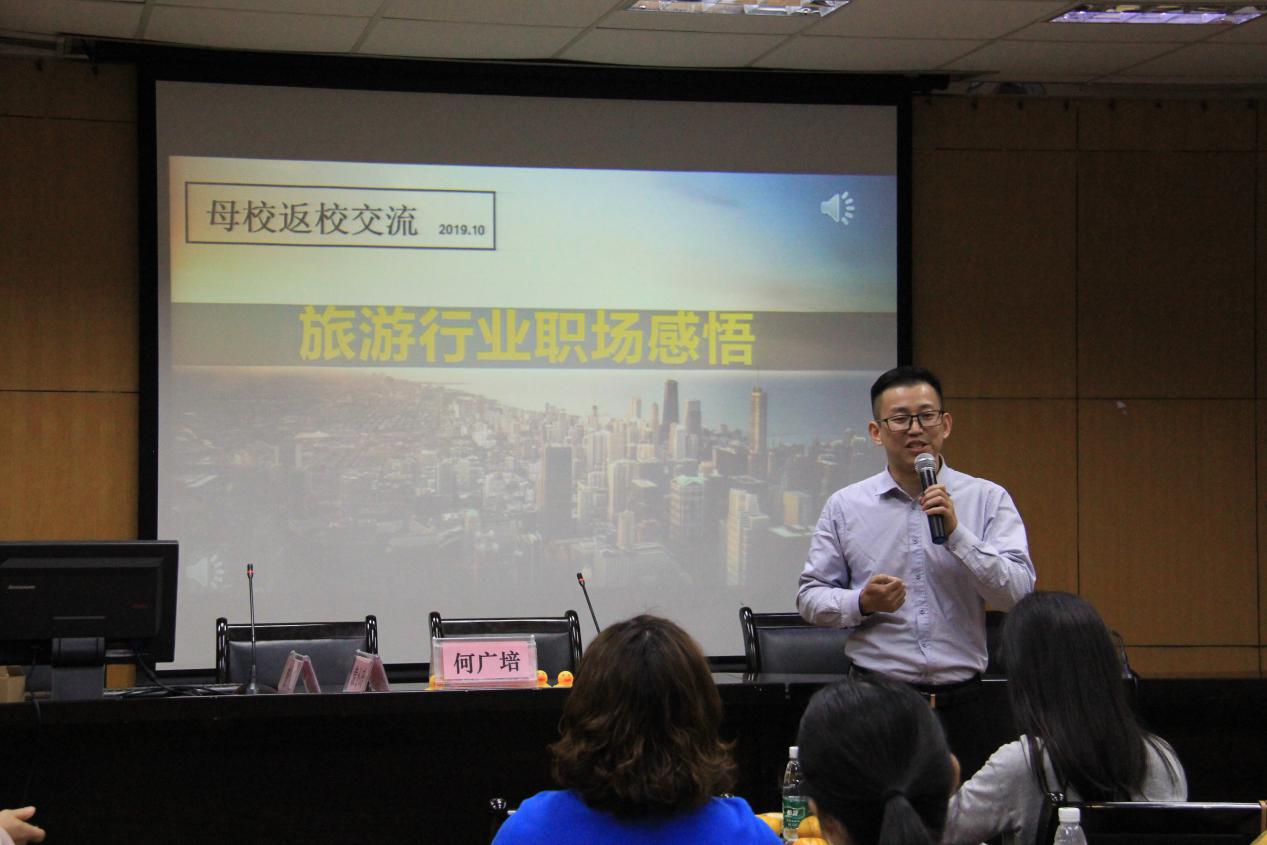 党委副书记冯绪猛首先致辞。他代表学院欢迎旅游管理系校友返校,认为校友作为学校最为宝贵的资源,能利用返校时间与在校学生进行面对面交流,为专业学生提供学业和职业指导,是一种很好的活动形式,希望大家把握好这次难得的机会。