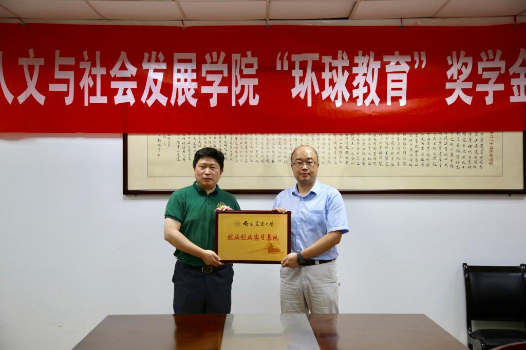 学院党委副书记冯绪猛与南京环球学校市场总监胡清熙签约设立就业创业实习基地,并为南京环球学校授牌。