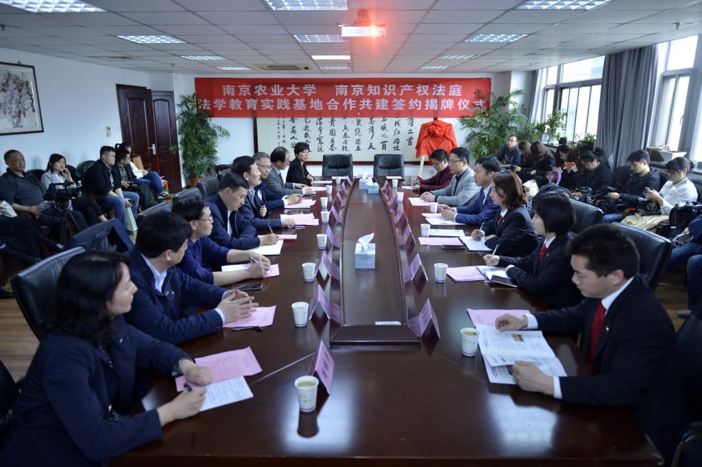 、南京知识产权法庭签署合作共建协议,盛邦跃与南京知识产权法庭庭长姚兵兵共同揭牌。玄武区人民法院副院长时超,南京知识产权法庭副庭长周晔,学校科研院、教务处、马克思主义学院、图书馆知识产权信息服务中心等部门领导参加了本次活动。