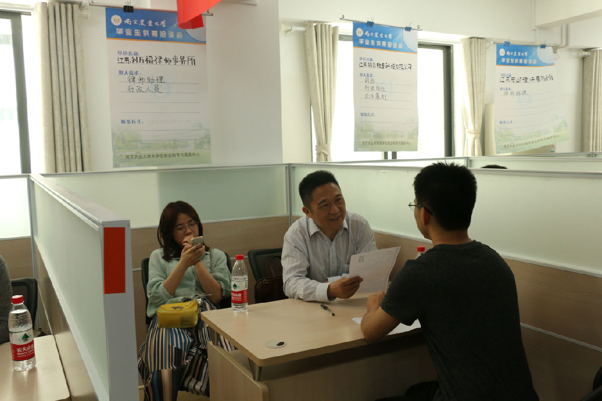 2017年双选会在大学生就业指导与服务中心顺利举行。本次双选会吸引了江苏刘万福律师事务所、江苏宏邺律师事务所、江苏锡彭教育科技有限公司、南京雨润食品有限公司等15家行业知名企业来校招聘。人文院党委副书记冯绪猛,团委副书记宋林霞,辅导员范梦衍、王誉茜等到场进行组织指导,并与企业代表进行交流。200余名应届本科生及部分研究生毕业生前来应聘。