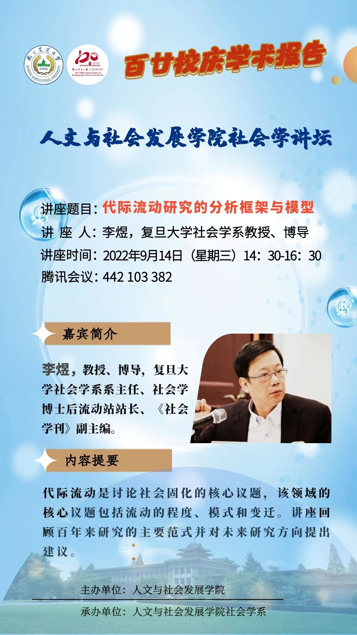 嘉宾简介:李煜,教授、博导,复旦大学社会学系系主任、社会学博士后流动站站长、《社会学刊》副主编。