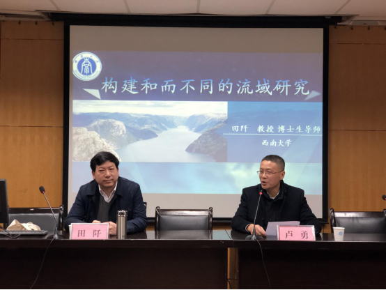报告伊始,卢勇教授代表全院师生对田阡教授的到来表示热烈欢迎,并对田教授进行了简短的介绍。首先,田教授指出这次学术交流旨在在学习和借鉴历史的学者关于流域研究的基础上,在新时代下让流域研究的视角、方法、新的分支学科的概念等方面展现出和而不同的学问。与此同时,田教授就自身的经历浅谈了从事人类学流域研究的缘由。随后,田教授就为什么研究流域发表了他的看法,他认为,将“流域人类学”发展成为一个有方法特色的民族学学术流派为愿景,提出“流域人类学”学术概念,构建了以流域为路径的理解区域文化的方法体系,逐步搭建了族群与区域文化理论构建,实现了以项目带研究,以研究育社会,将民族学特色的新视角和新理论与社会现实应用的有机结合。最后,田教授向我们讲解了流域人类学的概念、研究构想以及研究视角。他指出,流域人类学是指一河流为中心,以水为纽带,视人—地—水相互的作用为自然—社会综合体,将上中下游与左右岸的自然和人类群体连接为一个不可分割的整体。从人与自然关系的角度,重新阐释人类文明起源、发展与衰退的原因,重新认识区域文化,进而重新阐释人类社会,最终实现重构和谐的人与自然、社会关系的目标。