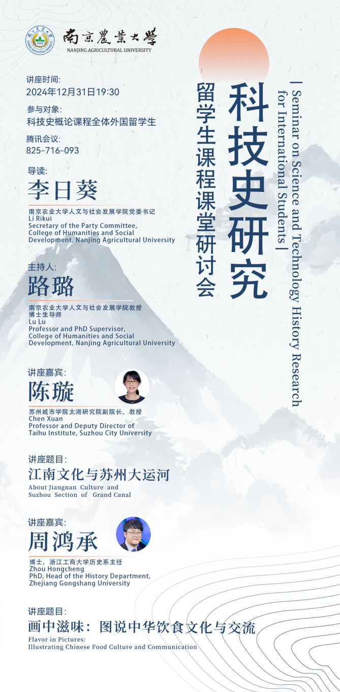 科技史研究课程的“留学生课程课堂研讨会”顺利举行。本次研讨会旨在为留学生提供深入了解中国科技史和传统文化的平台。苏州城市学院太湖研究院副院长陈璇教授、浙江工商大学历史系主任周鸿承教授应邀作了学术讲座。研讨会由18av